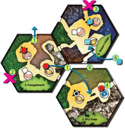 The red player pays one food to Explore and draws a hex (Dry Seep) from the hex pile. The red player then chooses which tunnel in Fungalreach they would like it connected to.