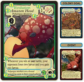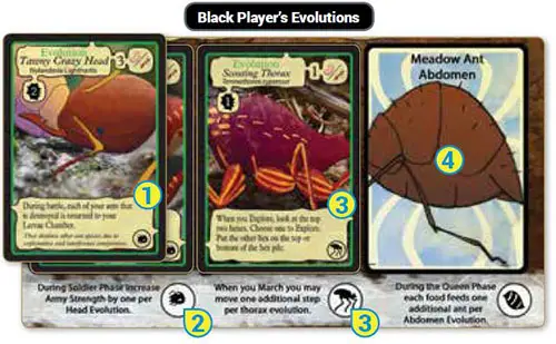 - Evolved Ant Body - Gain three colony points for each ant body that is complete. A complete body has a head, a thorax, and an abdomen. Players may complete and score multiple ant bodies, but each card may only be scored in one ant body.