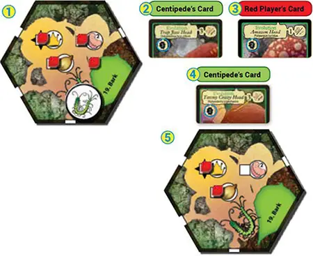 The ants win, and the centipede is destroyed. The centipede destroys ants equal to half of its total (five) rounded down (two). The red player gains one food and one colony point, and the centipede token is returned to the supply.