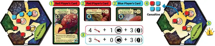 The red player loses one ant (half of blue's Army Strength rounded down). Blue would lose five ants (red's total Army Strength). The blue player only has three ants and loses them all. ferocity does not affect casualties.