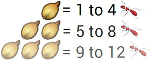 One food token feeds four ants. Larvae do not need to be fed. A player must use available food to feed their ants. If all of a player's food is consumed and ants remain unfed, that player must pay one larva to feed each unfed ant.