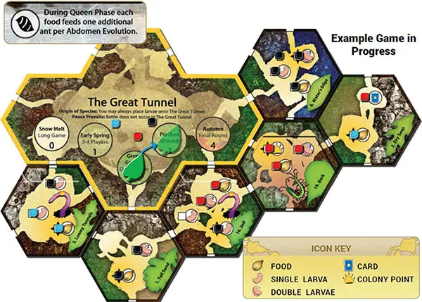 Players need to carefully manage their larvae and food, ensuring they have enough of each to perform actions, play cards, muster armies and feed their ants.