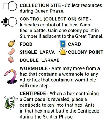 To inhabit a hex, a player must have at least one ant in that hex that inhabits a collection site. Players may not move larvae into hexes that they do not inhabit. Players may place larvae into uninhabited sites as a result of certain card effects.