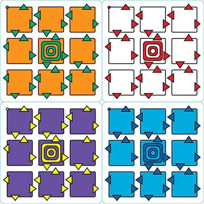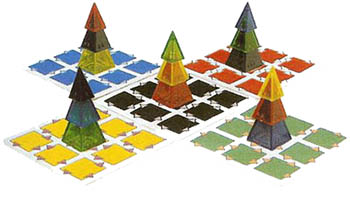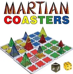 These colorful beverage coasters form a gameboard that changes during the game. Why the name Martian? Because the fictional origin of these pyramids is in the lost, ancient cities of the planet Mars.