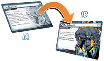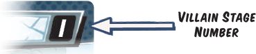 The villain is represented by multiple villain cards, and each card has a stage number in its upper-right corner.