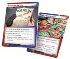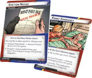 Remove the eviction notice card from the Spider-Man deck and set it aside. Remove the family emergency card from the captain marvel deck and set it aside.