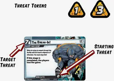 Each main scheme has a target threat value (top-left corner) that indicates the amount of threat needed on it before the scheme deck advances. Threat is checked continuously; anytime the amount of threat on a main scheme card is equal to or greater than the card's target threat, the scheme deck advances to the next stage.