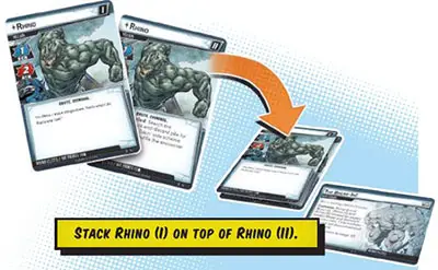 The Spider-Man, Captain Marvel, and Rhino decks have been pre-sorted in the core set for convenience. Only the cards in these three decks are used in the tutorial game.
