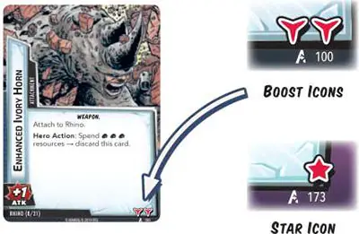 Turn the boost card face up. For each boost icon at the bottom-right of the card, the villain gets +1 ATK for this activation.