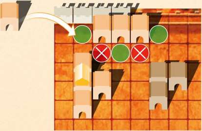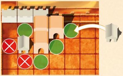 Example: The player decides to place an orange building. He can place his building on one of the three green marked spaces. He cannot place it on a red marked space, because this is too close to another palace. Also, no building can be placed on the wall spaces. Finally he cannot add his building to the other orange building, since that one is already claimed by Yellow