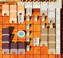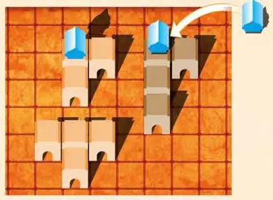 If a palace of the same color without a rooftop exists, any player play- ing a building of that color must built adjacent to this palace. This means it needs to be placed on an orthogonally adjacent space. A pal- ace can become quite large when many buildings of the same color are placed next to each other.