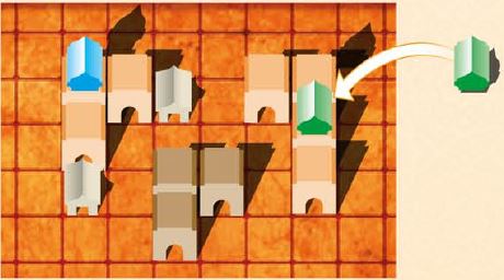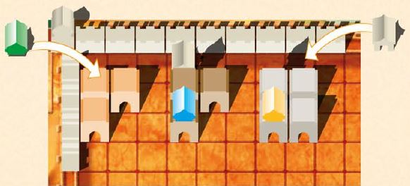 Example: The player decides to place a merchant. He needs to add a merchant at the beginning or at the end of the market street. He has three possibilities to do so. He cant place a merchant adjacent to two other merchants.