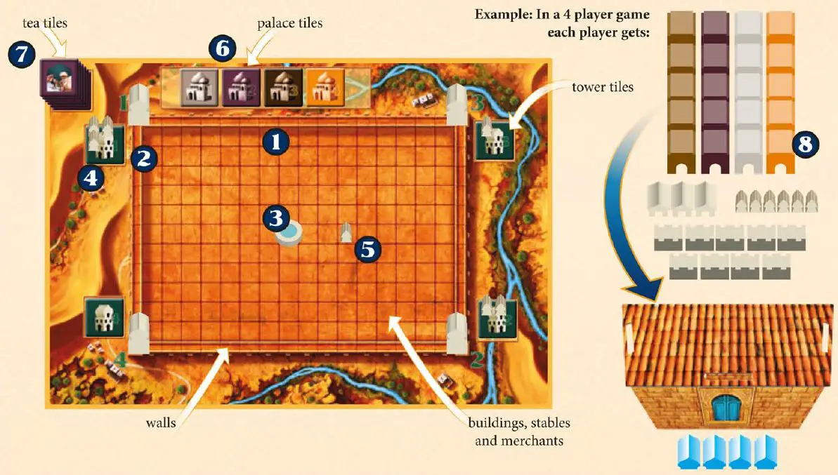 Strategy Hint: It can be very advantageous for the last player remaining in the game to build a few more merchants or wall sections. To stay in the game as long as possible, you should place as many of your buildings as possible, collect a few tea tiles and capture additional merchants from the tower tiles.