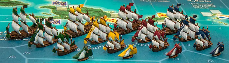 The Game Board is divided into 17 Sea-Zones. 16 of these have a port associated with them, represented by a national icon from one of the 4 nations in the game (Dutch, English, French and Spanish).