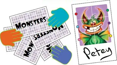 Mix up the Monsters cards and have each player draw one. This is the Monster the player must make to win, and should be placed FACE UP in front of the player. The rest of the Monsters cards are not used.