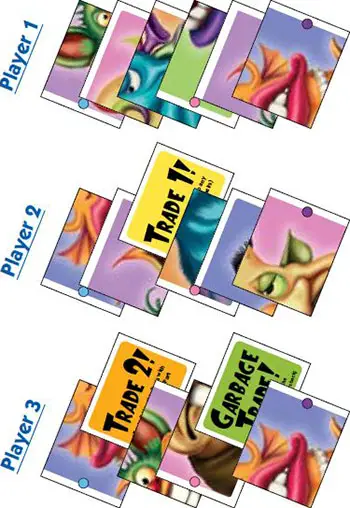 The player then discards a Monster Piece card to the top of the Garbage Pile, to stay at exactly 6 Monster Piece cards. The player must play the Garbage Trade card before looking through the Garbage Pile.