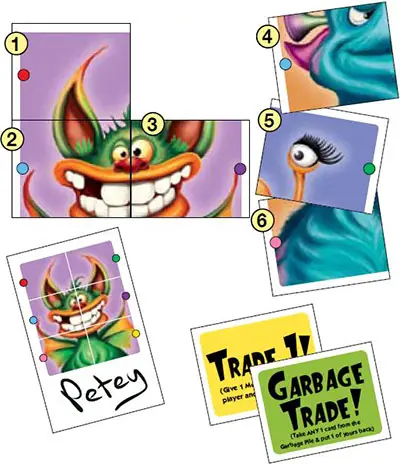), the dealer must reward bonus cards to those players until they have exactly 6 Monster Piece cards. The dealer keeps dealing cards until each player has exactly 6 Monster Piece cards.The dealer keeps dealing cards until each player has exactly 6 Monster Piece cards. Players can have any number of Trade cards - the more the better. Trade cards are used later in the game.