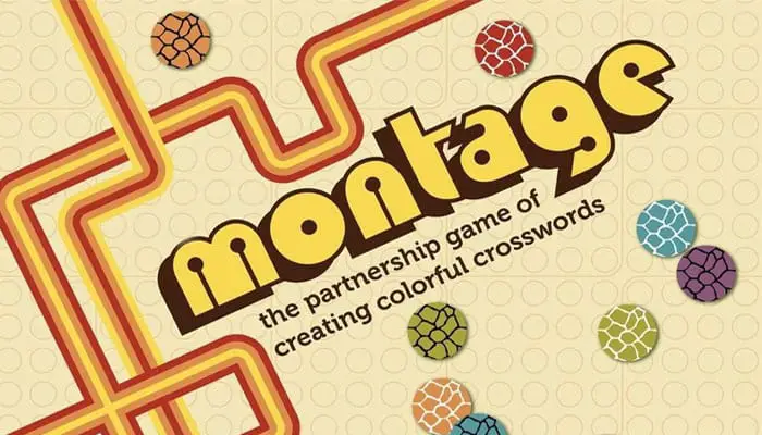 Montage is a partnership word game in which each player, in turn, thinks of a word, "spells" it on the crossword-like grid using color-coded tiles - each color corresponding to one vowel and five or six consonants, e.g. yellow is A/B/C/D/Z and green is U/T/V/W/Y/X - then gives a clue, in the hopes that his partner can guess the word before either of the opponents do.