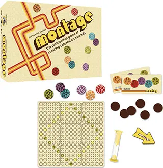 MONTAGE is a partnership word game for 4 players played on a board of 9 'zones' using colored chips. Invented by Joli Quentin Kansil in 1973, several games experts consider Montage to be the most original of the 36 games he has designed.