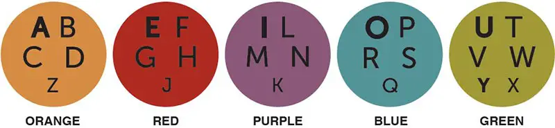 Each of the 26 letters of the alphabet is assigned to 1 of 5 color groups:
