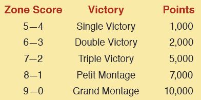 The game is then scored with the winning side earning anywhere from 1000 points for a 'Single Victory' to 10,000 points for a 'Grand Montage'.