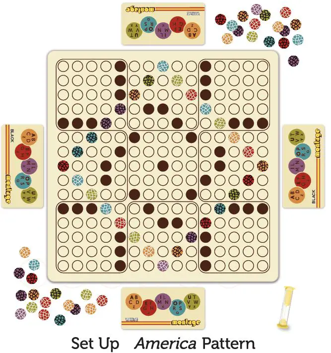 In Montage, each of the 5 different colored chips represents 5 or 6 letters of the alphabet and so all words are made with colors! The side that earns 4 zones first is the winner.
