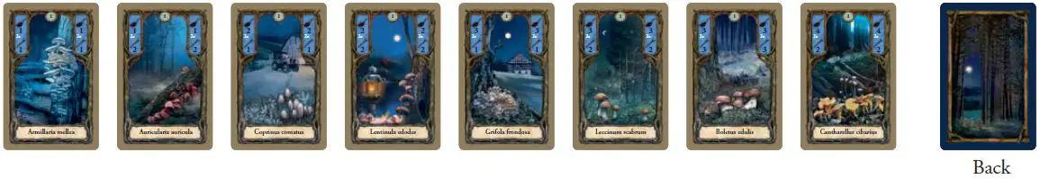 Mushrooms gathered under the glow of moonlight are even more delicious ... If you take a Moon card, put the card onto the discard pile and draw a Night card instead. Each type of mushroom (apart from the Morels and the Fly agaric) has 1 corresponding Night card.