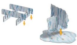 Put the two iceberg sections together, as well as the frame for the ice floe, as shown in the illustration. Then insert the iceberg into the ice floe and put it onto the frame.
