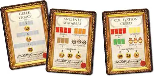 Patron Collections are composed of various Civilisation/Domain/ Continent card Collections as shown on the Patron card chosen by each player at the start of the game (see step 4 of player Setup).