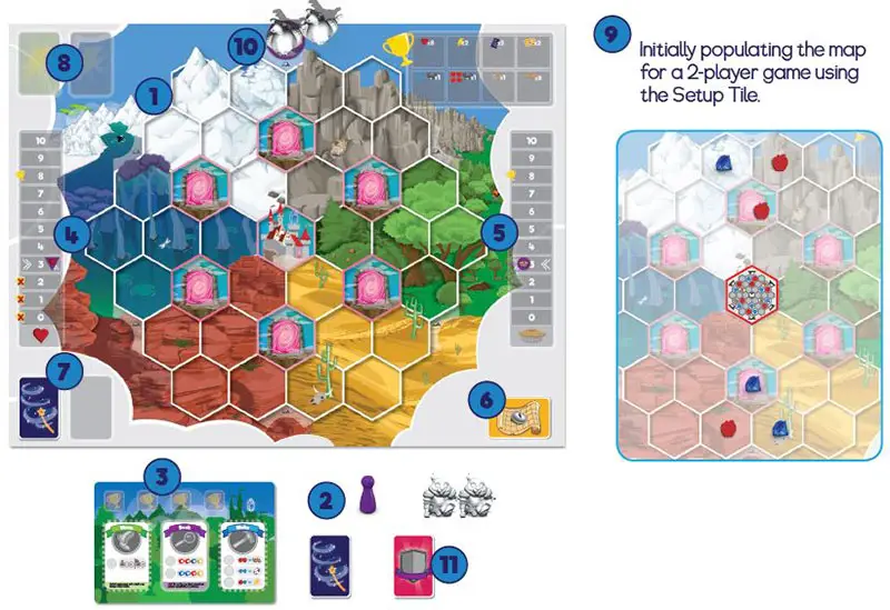 9 With the Setup Tile face down, randomly orient it on the center Castle Everfree space of the map. Turn the Setup Tile over, aligning it with the space's edges. Populate the sets of 3 spaces in front of each active player's Base Camp Tile with resources depicted on the tile, then discard the tile. Sets of spaces in front of inactive base camp sites are not populated.