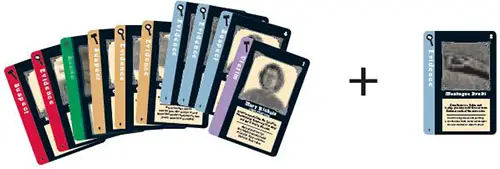 Evidence cards: No one can play any Evidence cards until there is a Victim card in play. Evidence cards are played in melds. A meld is three or more Evidence cards of the same color. You can also play Evidence cards by themselves if they go with a meld that is already on the table.