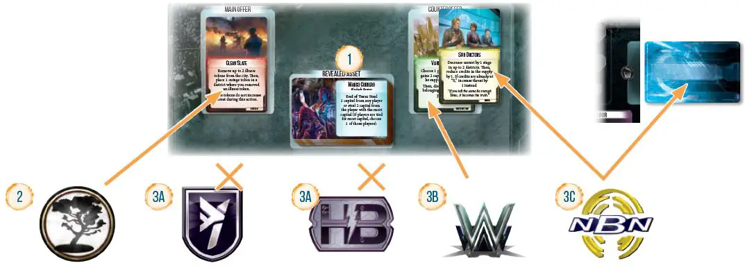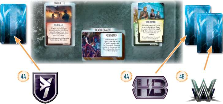 The winner of the deal resolves the action card he proposed for his offer. Then, he claims the revealed asset card, placing it faceup next to his corp sheet. All action cards played as offers or in support are discarded facedown to the discard pile.