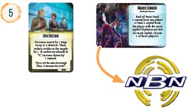 NBN wants to propose "Spin Doctors" as a counteroffer. To become the new countering player, she discards one card from her hand (placing it next to the slot of the board with the garbage can icon) and places "Spin Doctors" on top of "Vanity Project".