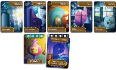 Place the toilet card in the center of the play area. Shuffle the deck of location cards and place four cards, faceup, to the right of the toilet card. Clue cards will be added below the location row, so leave space for them. Place the remaining location cards off to the side.