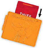 Then slide a Thief card into the decoder with the red "Gamewright" logo sticking up out of the back. Place the Clue decoder within reach.