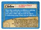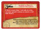 If a city with a hospital ever has 4 or more patients of the same color in it, the hospital is overrun and everyone flees the city. Instead of doing a normal outbreak when this happens, move every patient of that color in the city into adjacent cities. Players may decide which cities the cubes are moved to.