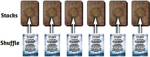 Shuffle 1 Storm card into each pile, facedown. Stack these piles to form the Player deck, placing smaller piles on the bottom.