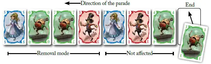 The remaining cards in the parade are moved forward towards the front of the parade to close the gaps. If a card with the value 0 is played, all cards enter removal mode.