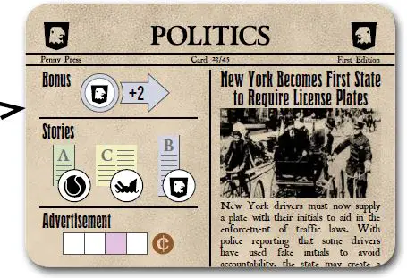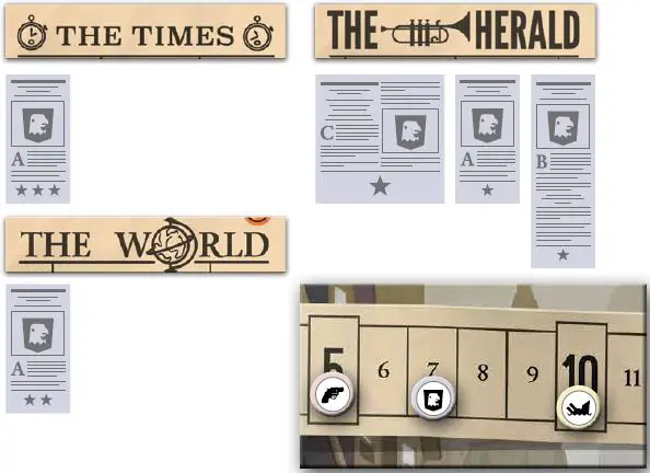 Bonuses are awarded at the end of the game for the players who best cover the five leading news beats, or categories, of the day: War, Crime & Calamity, New York City, Politics, and the Human Condition.