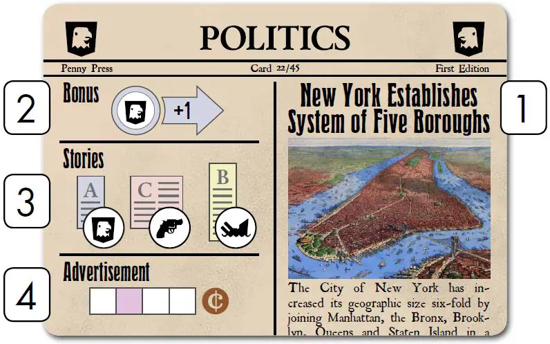 Headline cards reveal the news being reported on in turn-of-the-century New York City. Each card falls into one of the five news beats, as listed at the top of the card. The news beat will determine which bonus marker is moved, and a story from that news beat will always come out onto the board.
