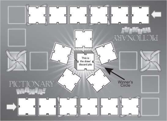 Lay five Category Tiles face down in the spaces in Winner's Circle. The balance of the Category Tiles are placed face down in a pile in the center of the Winner's Circle. This is the draw/discard pile.