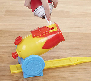 Thoroughly clean all components with water. To clean inside the cannon, first pull off the sliding piece that covers the top cannon door.
