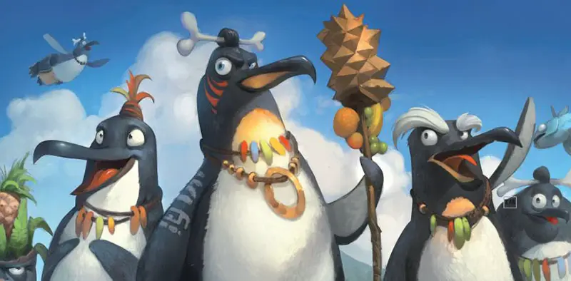 Adventure cards trigger actions to be completed before the "Pingo Pingo" cry in the soundtrack. Get up and run from one base to another to cross a suspension bridge. Grab the gun and aim well to defeat fearsome bear riders. Tap the friendly monkey sorcerer to regain life. Run to the shipwreck and back to shoot the gigantic space penguin. Grab all the previously played cards and deal them as fast as you can to escape the penguin rampage!