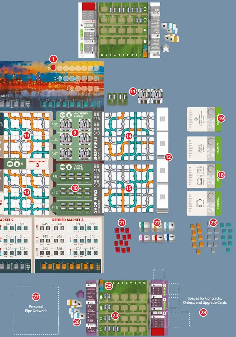 Each player places one cube of each oil color on the 0 space of the Pipeline track at the top of their player board