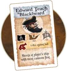 In battle: Blackbeard shoots 6 dice against other pirates' hulls (attacking the pirate with the most cannons first); his Hull takes 8 hits before sinking; has a Sail value of 24; and is worth 6 Fame points if defeated.