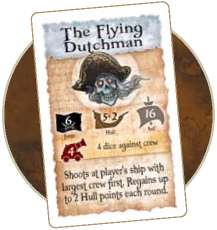 The skeleton crew aboard this famed phantom ship gives her special recuperative powers. If hit in combat, the Flying Dutchman will regain up to 2 hull points at the end of each combat round (i.e. after all ships in the battle have fired once), until sunk.