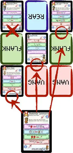 Example: Shekhtur only has a melee attack (like most leaders), so she can attack the closest hero in a column. In this case she could hit Seth, (the opposing leader), his Illusionist, or his Overlord. She would not be able to hit the Mystic, who is protected by the vanguard-row Illusionist.