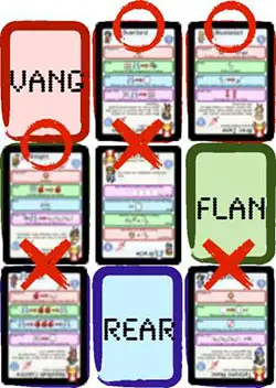 Melee attacks can only be made by the frontmost card in a column. In this example, only the cards with O's are capable of declaring melee attacks. The others (who have X's) aren't positioned to perform melee attacks.