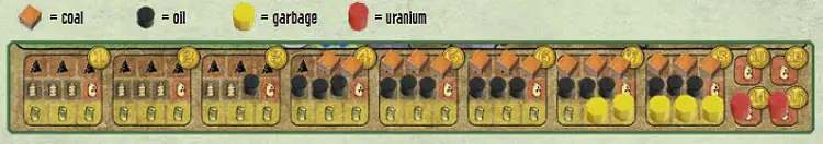 The large spaces at the bottom of the board represent the resource market. At the beginning of the game, place 3 coal on spaces 1 to 8; 3 oil on spaces 3 to 8; and 3 garbage on spaces 7 and 8. None of these resources is ever placed on spaces 10 to 16. Place 1 uranium on each of the spaces 14 and 16.