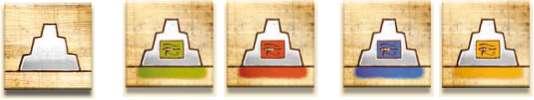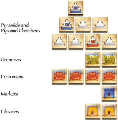 Each player uses his pyramid tiles and pyramid chamber tiles to build a step pyramid. Each subsequent layer of the step pyramid contains one tile fewer than the layer below. The player may rearrange the tiles in his pyramid at any time as he wishes, but he may only build one pyramid during the game.